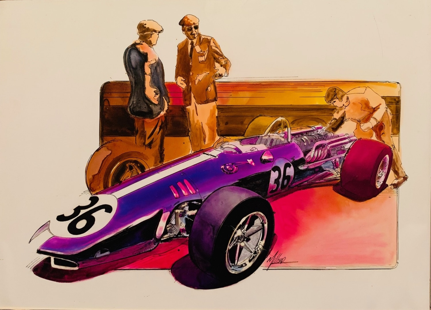 We are presenting for sale an original DEREK MILLSAP luma dyes painting entitled EAGLE-WESTLAKE T1G GURNEY 1967, painting done in 1986. This car won the 1967 Belgian Grand Prix and is often regarded as the most beautiful Grand Prix car ever raced at the top levels of international motorsports.