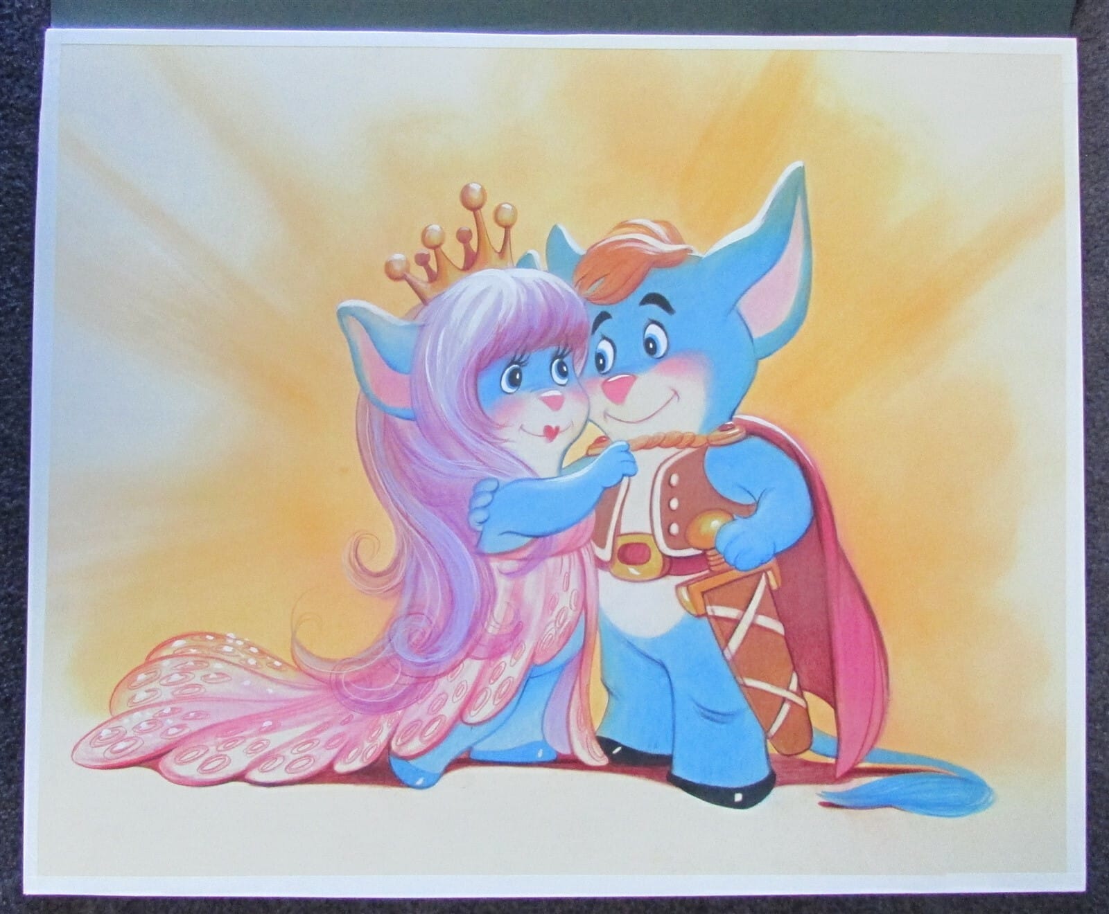 We are presenting for sale an original ATTRIBUTED TO REBECCA MILLS colored marker on board painting entitled HERO AND HIS PRINCESS done for Wishkins.